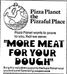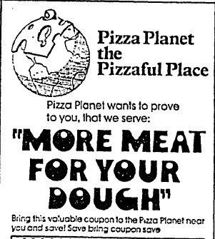 Pizza Planet was a local chain in Oklahoma City. Dr. Phil McGraw worked at one when he was a teenager. In high school, I decided I wanted to try it out, but the one in our part of the city had closed. My friend Jeff and I drove to far northeast OKC to find one. We frankly stuck out like sore thumbs amongst its clientele, but the pizza was delicious.