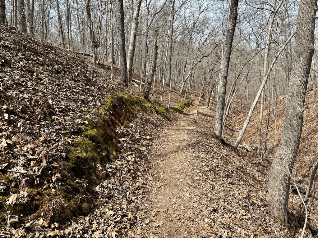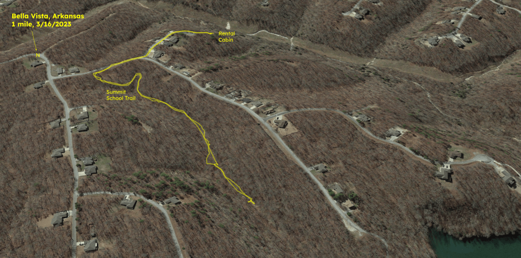 As for its name, there was a Summit School in Bella Vista from 1896 to 1945. It was about 1.25 miles southeast of the eponymous trail. The trail which actually runs close by the former Summit School’s location is the Mulligan Trail. It seems fitting that Bella Vista’s trail system has names as confusing as its maze of streets.
