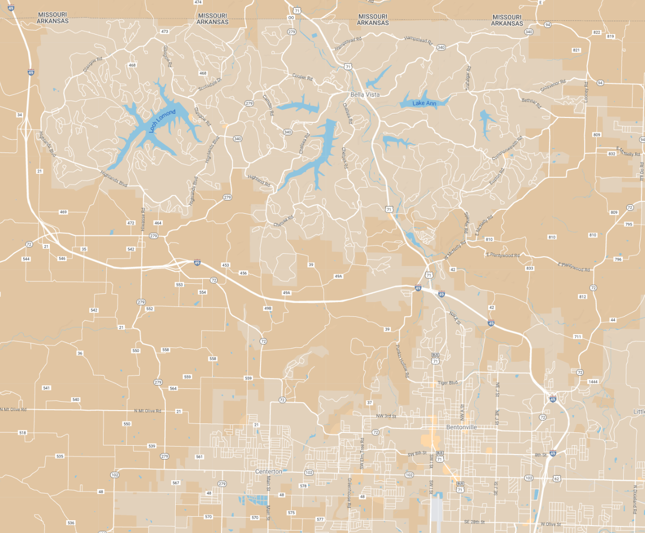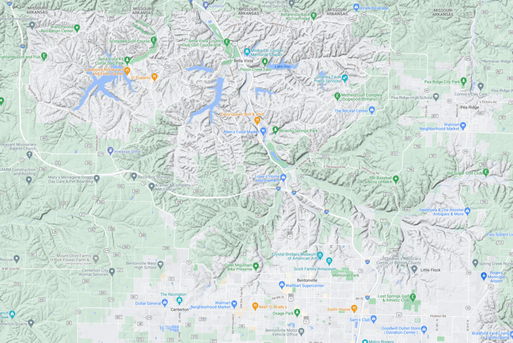 I was truly grateful for GPS when navigating to and from that cabin. Just a glance at a map tells you that Bella Vista is no ordinary town. It is filled with a maze of twisting, interconnected residential roads which mostly follow the top of Ozark mountain ridges, while Bentonville and Rogers have more conventional street grids on the flatter land to the south.