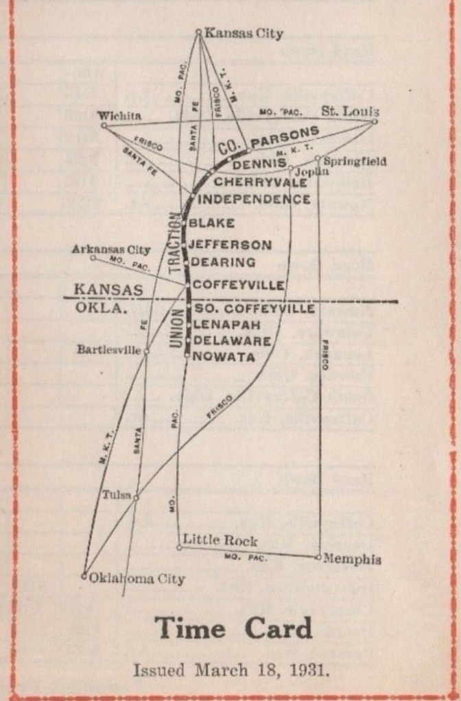 The Union Traction Company was created in 1904 and initially linked Coffeyville, Independence, and Cherryvale, Kansas. By the 1930s it had grown to reach 88 miles from Parsons in the north down to Nowata in Oklahoma. It ran right past Grabham Station, and remained in operation until 1947.