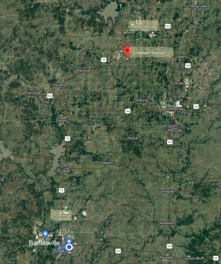 The family moved 27 miles northwest as the crow flies, and maybe 35-40 miles by road, to Grabham Station about five miles southwest of Independence. Dewey was a small town, small enough that the Meadors once packed into their Studebaker Erskine on Saturday nights to drive four miles to Bartlesville to shop and people watch. But Grabham Station wasn’t even a town.