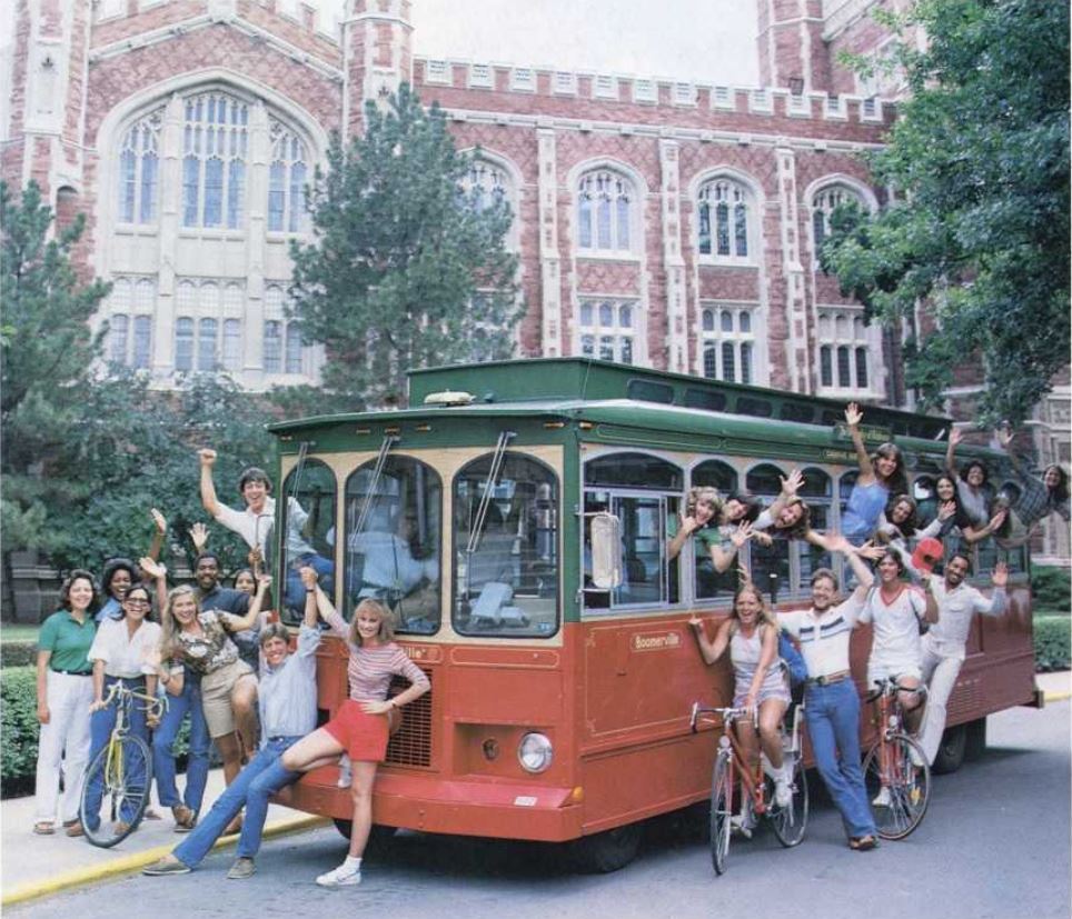 My only regular rides on a “trolley” were as an undergraduate at the University of Oklahoma, which began running the Boomerville “trolley” in 1980. It was made to resemble an old-fashioned trolley, complete with wooden interior seats, but ran around campus on rubber tires, not tracks, and was propelled by an internal combustion engine. There were a few of that style of trolley in the university’s system while I was there from 1984-1988, but they soon added regular coach buses, which I greatly preferred. They had far more comfortable seats and were air conditioned.