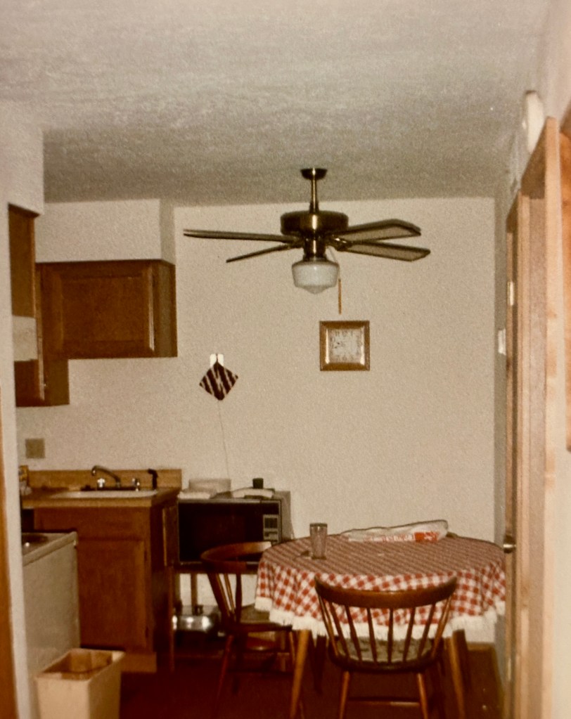 The living room was also adorned with a dreadfully uncomfortable Papasan chair with a loud 1980s floral print cushion and an old love seat. I squeezed a small mid-century modern wooden table and chairs into the tiny dining area, complete with old Pizza-Hut style checkered tablecloth.