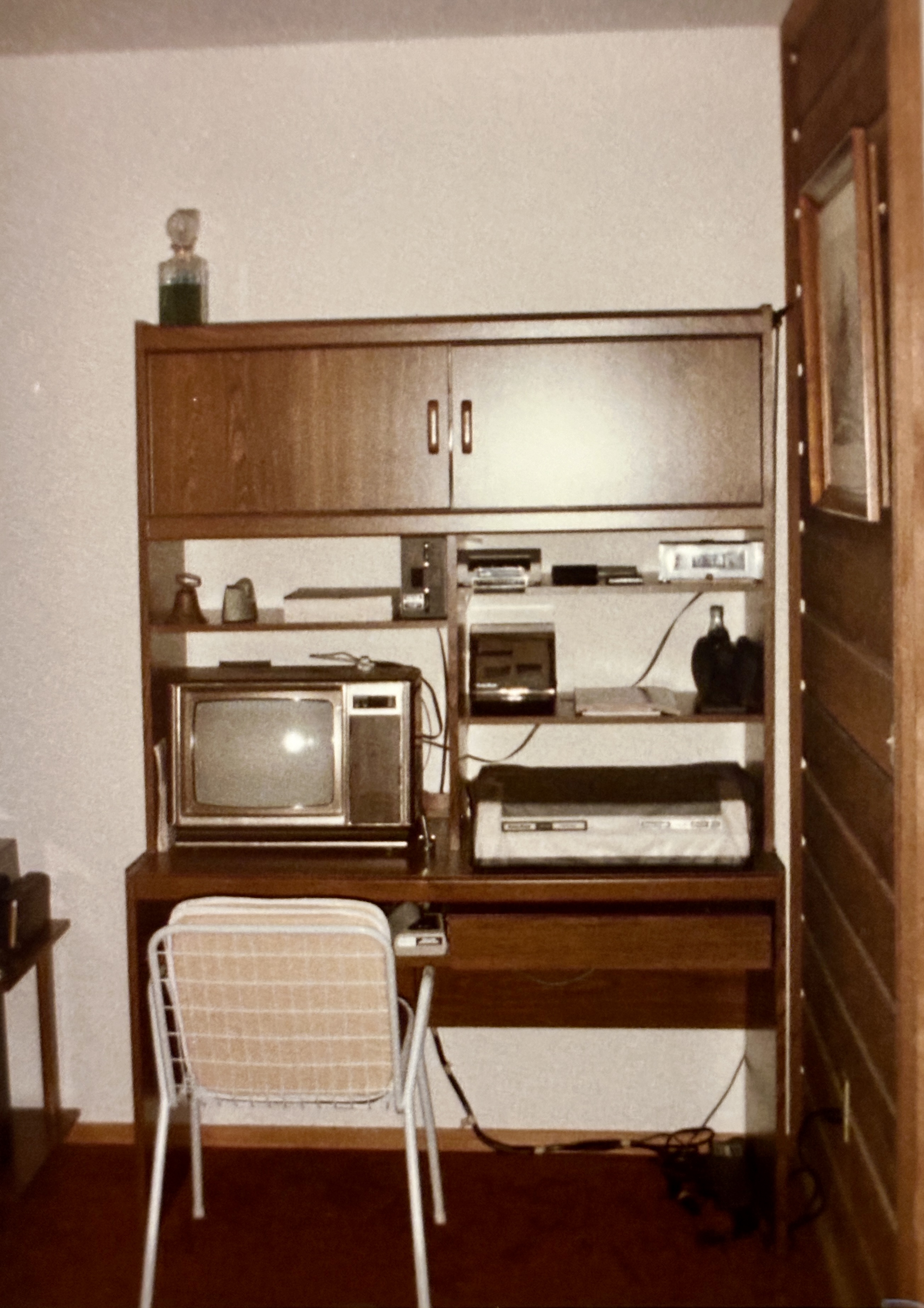 I set up my Color Computer again, this time on a pressboard desk and hutch with my 13″ television doubling as its monitor. The setup included a joystick, floppy disk drive, daisy wheel printer, and a modem to connect to the university’s engineering computer as well as CompuServe. I still remember that my CompuServe username was 71460,2557 even though, like Orange Donuts and Death Puppy, CompuServe disbanded long ago.