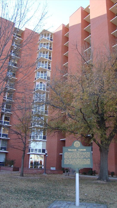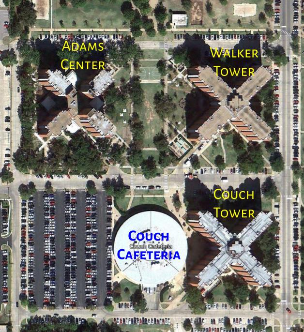 The Walker Tower dormitory opened in 1966 as Couch North and was renamed in 1970 to honor a prominent banker. It housed over 1,400 students in the four wings of its twelve stories. Next door was the Adams Center, built two years earlier and named for K.S. “Boots” Adams of Phillips Petroleum, with four towers connected at ground level. Across the street was the Couch Tower, seemingly identical to Walker, although in 1984 it was rented out by the U.S. Postal Office’s training center.