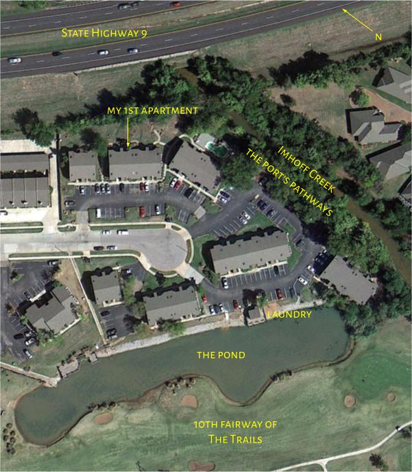 It was all part of The Port apartments, which had been built in the early 1980s just northeast of a new golf club, The Trails, built between state highway 9 and the river. The apartments were northeast of the club’s 10th fairway, separated by a large pond. The place had a nautical theme, with heavy ropes, life preservers, etc. The laundry was built on pilings, projecting out above the pond.