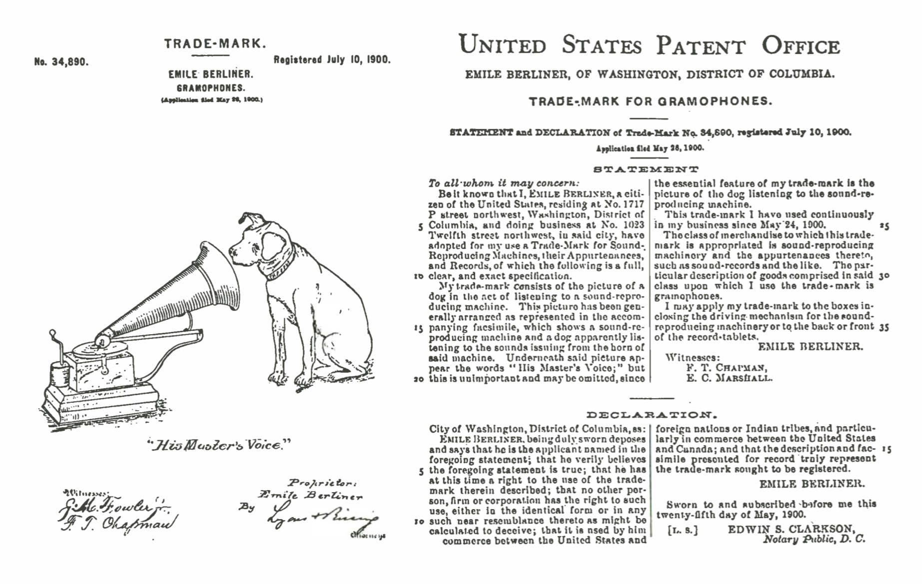 The logo and the phrase “His master’s voice” appeared in advertising literature and sometimes on company stationery. Emile Berliner visited the British office in May 1900, saw the painting, and soon registered it as a trademark over in America. Eldridge Johnson soon took over Berliner’s rights to the trademark for his new Victor Talking Machine Company and began heavily promoting it.