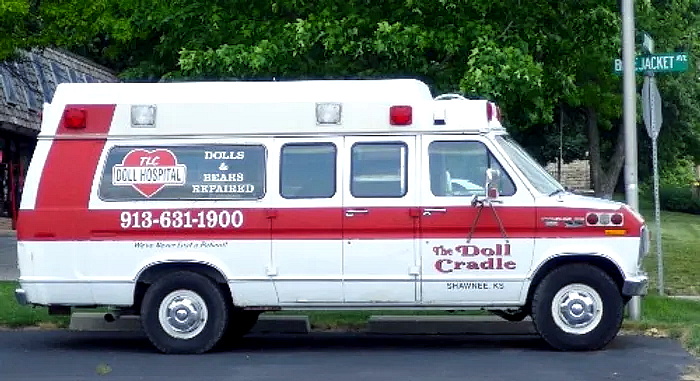 We reached the outskirts of Kansas City before noon. Wendy has been re-rooting the hair of vintage and newer Barbie dolls for some time, and she wanted to shop for Barbies at a place one of her YouTube contacts had told her to check out: The Doll Cradle in Shawnee, a Kansas City suburb. They have been repairing dolls for over 50 years and even have a fun Doll Ambulance.