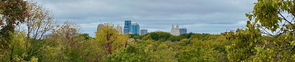 Scarritt and his wife had nine children and gave them property for homes, some of which still exist in one of the oldest neighborhoods of Kansas City. Some of the downtown skyscrapers peek over the trees at Scarritt Point.
