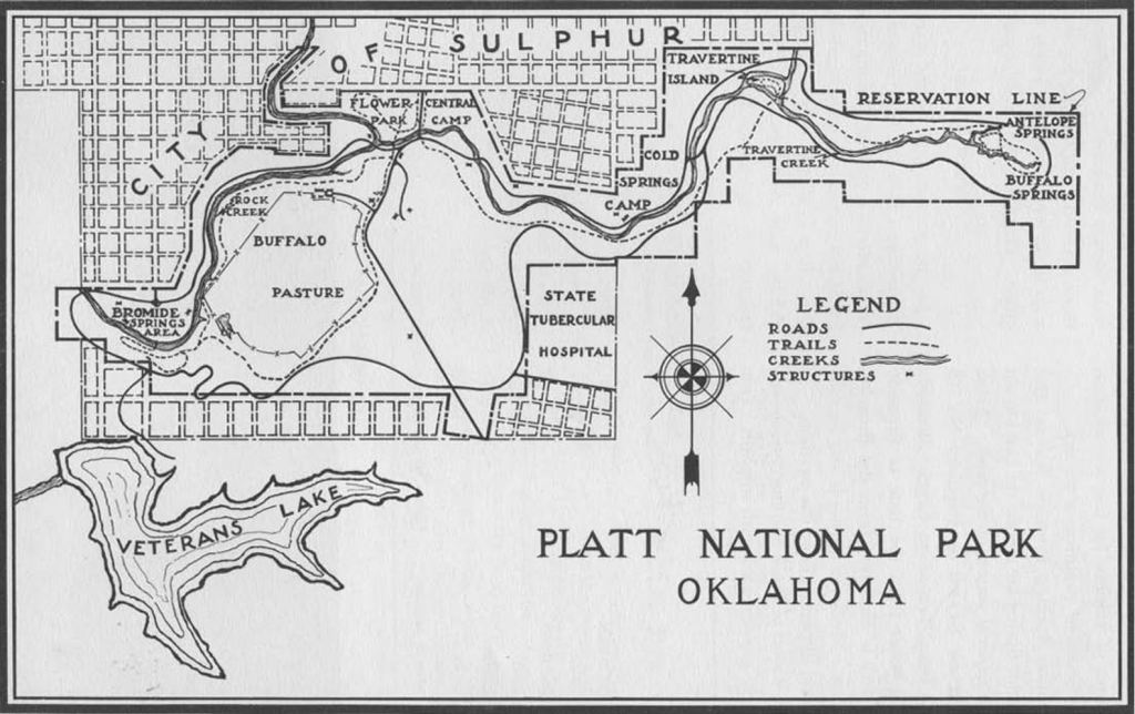 The city of Sulphur developed directly north of the park, which in the 1930s boasted eighteen sulphur, six freshwater, four iron, and three bromide springs.