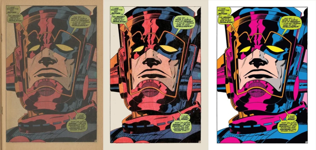 I won’t be reading any vintage Marvel comics online, since the reprints are so garish. Below are images from colorist Jose Villarrubia, who wrote, “Kirby’s robust art could stand more vibrant coloring than most. However, it looked so much better the way it was colored originally. Here is one of the many splash pages in the classic Thor #160. On the left is a scan of my personal copy; in the center is how I would restore it, and on the right is the way it looks in Marvel reprints.”
