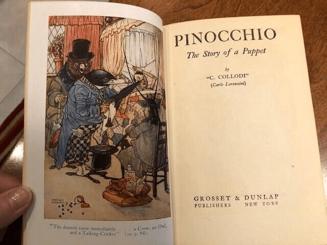I was precocious, reading 135 books in first grade. So a couple of years later my parents gave me a hardbound edition of the Pinocchio book. It had an orange cover and had been printed by Grosset & Dunlap decades earlier. I suspect my father picked it up at a garage sale.
