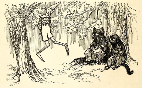 I enjoyed him meeting the fox and the cat, with the former pretending to be lame and the latter faking blindness. They reminded me of Mark Twain’s twin grifters in Huckleberry Finn, the duke and the dauphin.