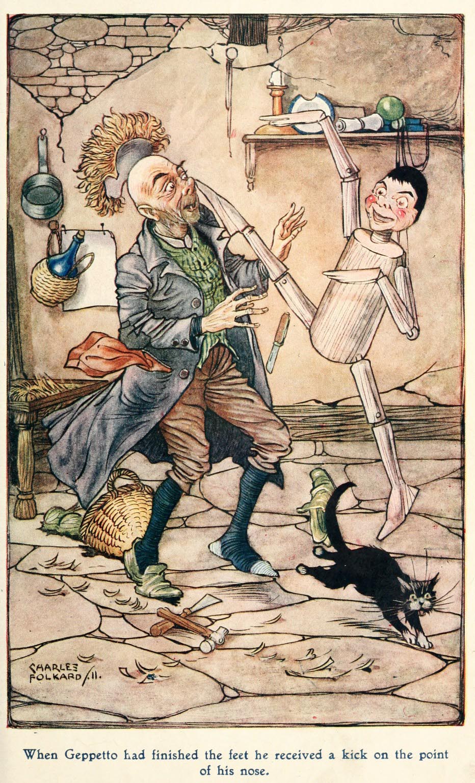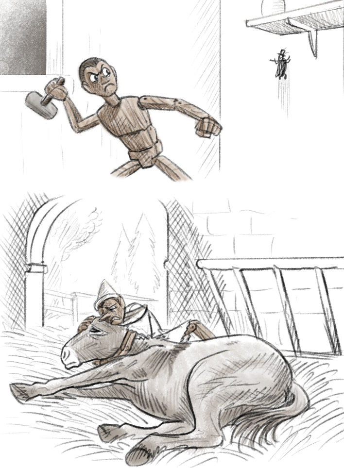 Geppetto soon carved the “puppet” Pinocchio from the talking piece of wood, with no talk of wanting a little boy, no blue fairy, etc. Rather than living in a shop full of clever clocks, he was so poor that all his room had was a worn-out chair, a crummy bed, a derelict little table, and on the far wall a painted fire.