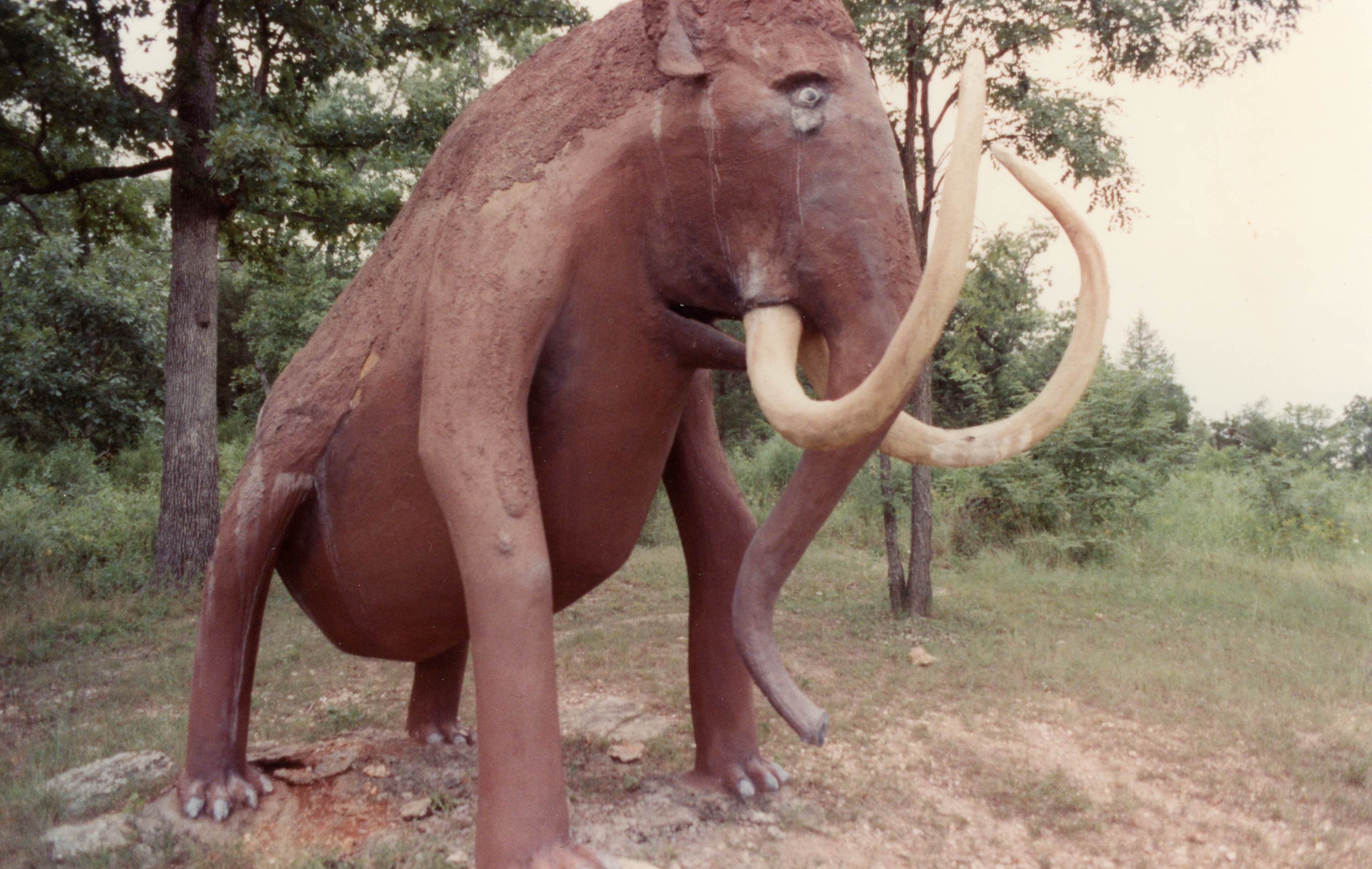 A concrete mammoth at the former Dinosaur Park in 1988 created with little grasp of anatomy; photo by Jeremy Butler