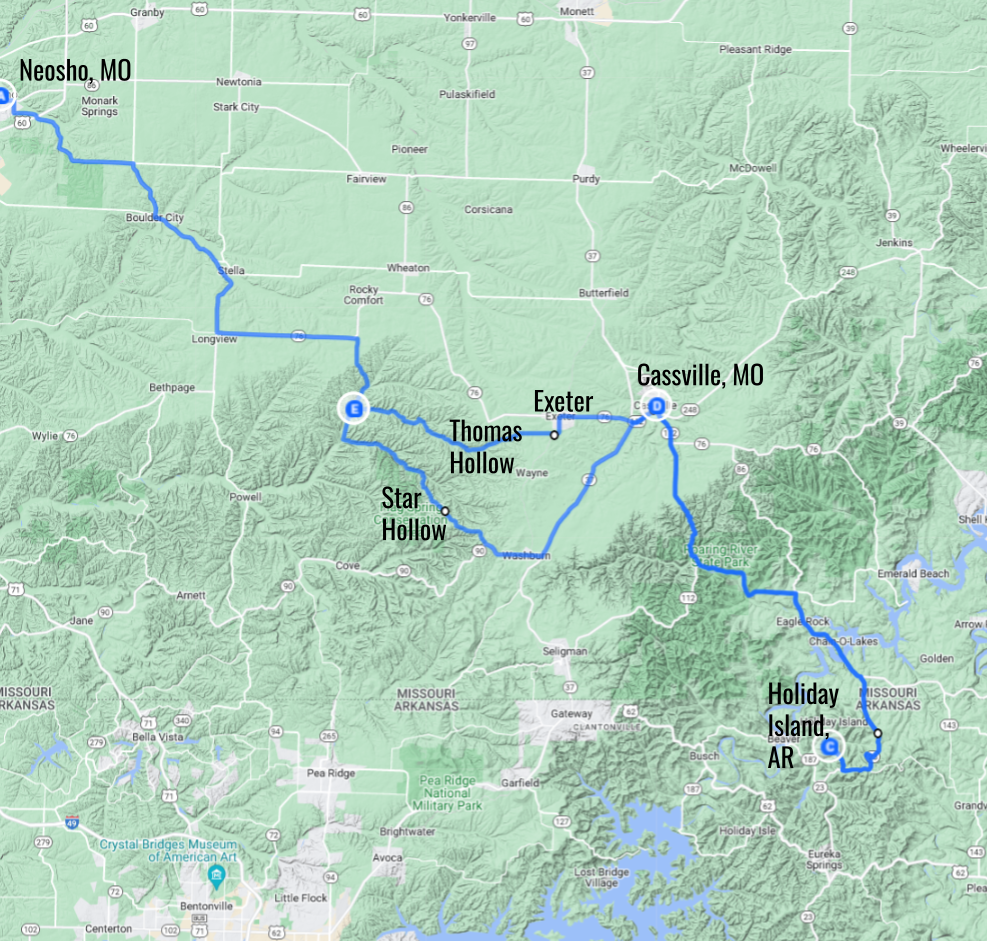 Southwestern Missouri is replete with ancestors of mine from my father’s side, and I have been vacationing there for a lifetime. The traditional route for my parents to get there from Oklahoma City was to follow Interstate 44 to Fairland and then head east on US 60 to Neosho, Missouri. From there we could take a variety of routes leading southeast to Cassville and on to our vacation cabin on Table Rock Lake. But we seldom if ever took the route I chose for this trip.