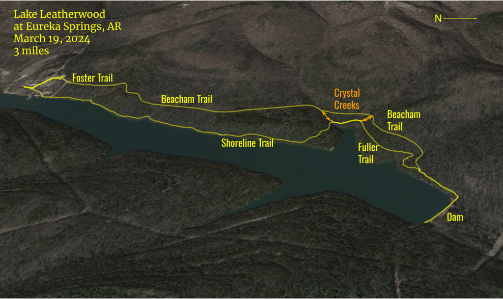 While on break, we did our usual three-mile loop at Eureka Springs’ Lake Leatherwood. We started out from the parking area along the Foster and Beacham Trails, which are both hillier and sunnier than the other options.
