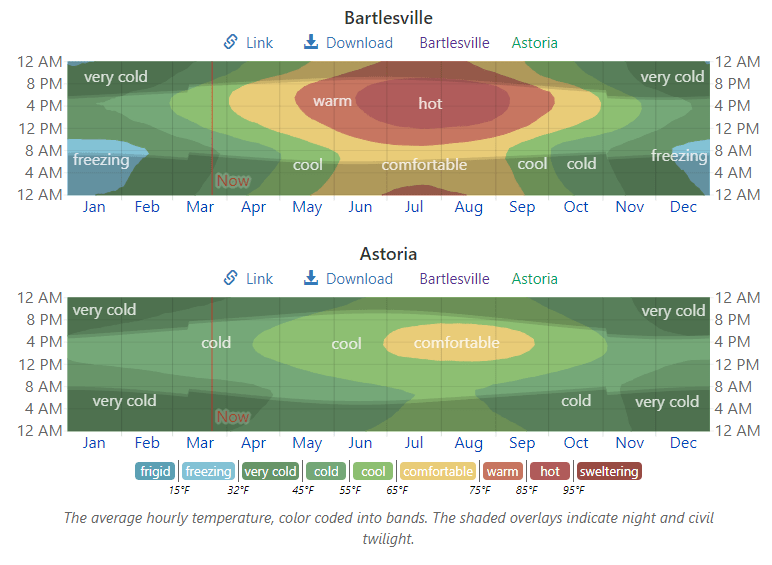 At this point, my inclination is to retire in Bartlesville but escape to the Pacific Northwest from June through September. Wendy has only been out there once, for our honeymoon in 2016, while I made summer trips there in 1998, 2005, 2006, 2008, and 2009. One of our favorite stops was in Astoria, Oregon along the mouth of the Columbia River a few miles from the Pacific Ocean. Below is a comparison of the climate there to that of Bartlesville.
