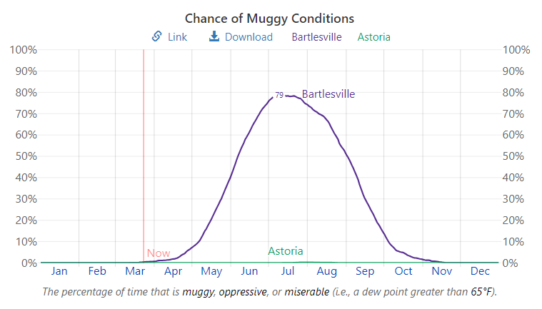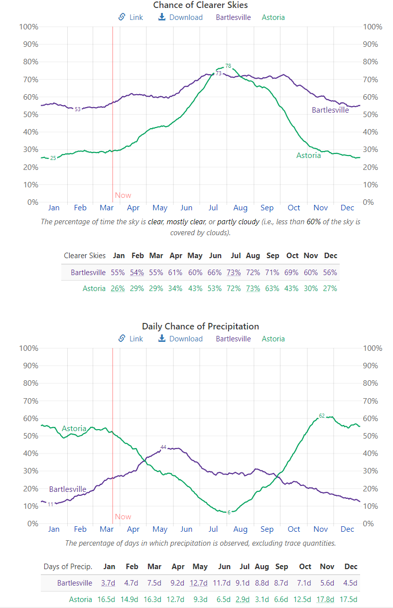 Obviously, Astoria is not the place to be if you like to swim or lounge by a pool. And while its winters are not harsh, due to its proximity to the ocean, they are overcast and rainy. But from May through September the daily chance of rain is actually higher in Bartlesville than in Astoria.