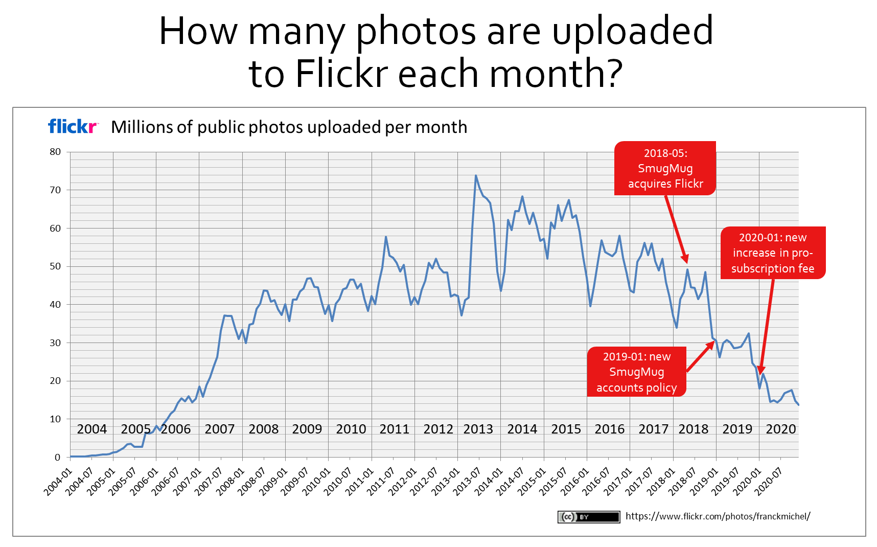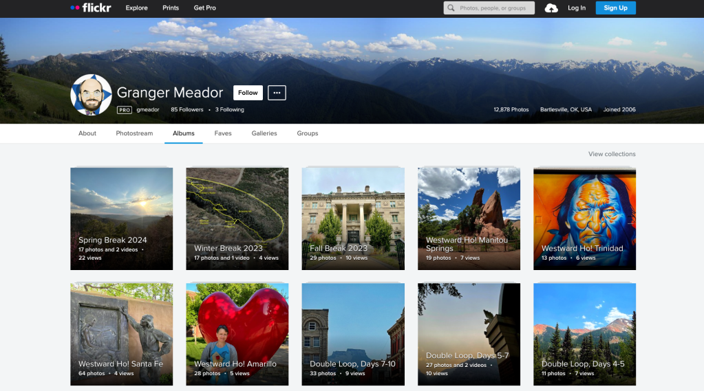 I have 12,784 photos and 157 videos consuming 53 GB on Flickr, and they’ve collectively garnered over 2.3 million views. But Flickr faded over the years, with few interface updates and declining engagement. I used to get several solicitations each year from people either seeking permission to use one of my Flickr photos or offering payment for licensing. For awhile, unsolicited sales paid for the cost of my Pro account, but that hasn’t happened in years.