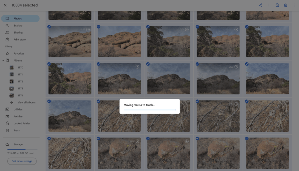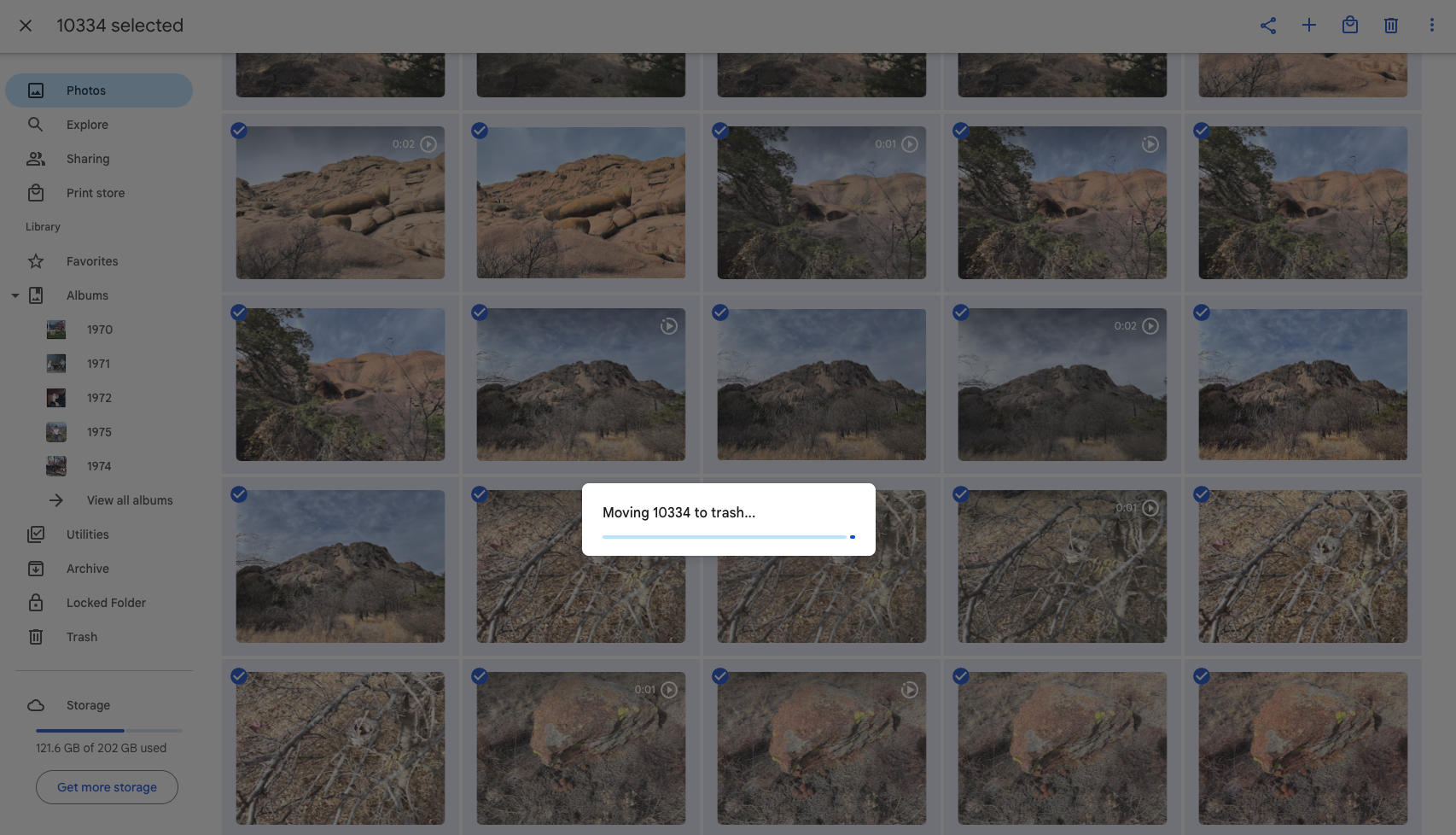 It didn’t work to select the first photo and rapidly zip down to an earlier date with the right timeline sidebar to select the last one: that didn’t select the photos in-between. A perusal of the internet showed that Google hasn’t made a provision to bulk-delete your photos. So I went through the manual process, deleted thousands of photos at a time.