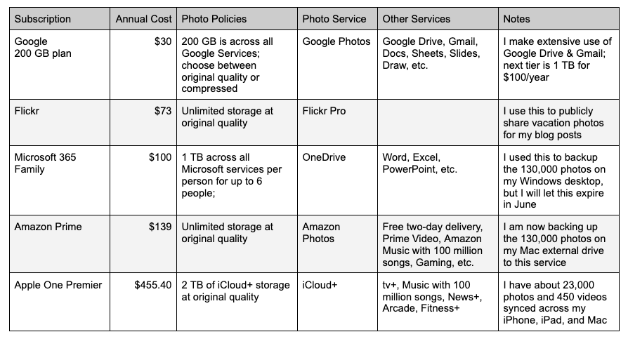 I decided to take stock of the various subscriptions I have that include photo storage: