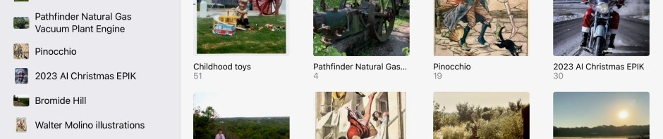 As my number of albums multiplied, they had become harder to manage on my iPad and iPhone, and I had wished for a way to nest them so that I could put travel albums in one group, history albums in another, etc. I didn’t know of a way to do that in iOS until I Googled the topic today. It turns out that you can do that on an iPad by tapping All Albums in the sidebar, then tapping +, then New Folder. However, I find selecting a dragging albums on an iPad cumbersome; I’d much rather organize them on a big screen using a mouse. So it was time to start doing just that with my Mac mini.