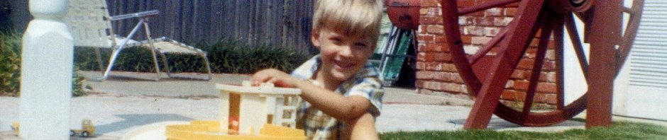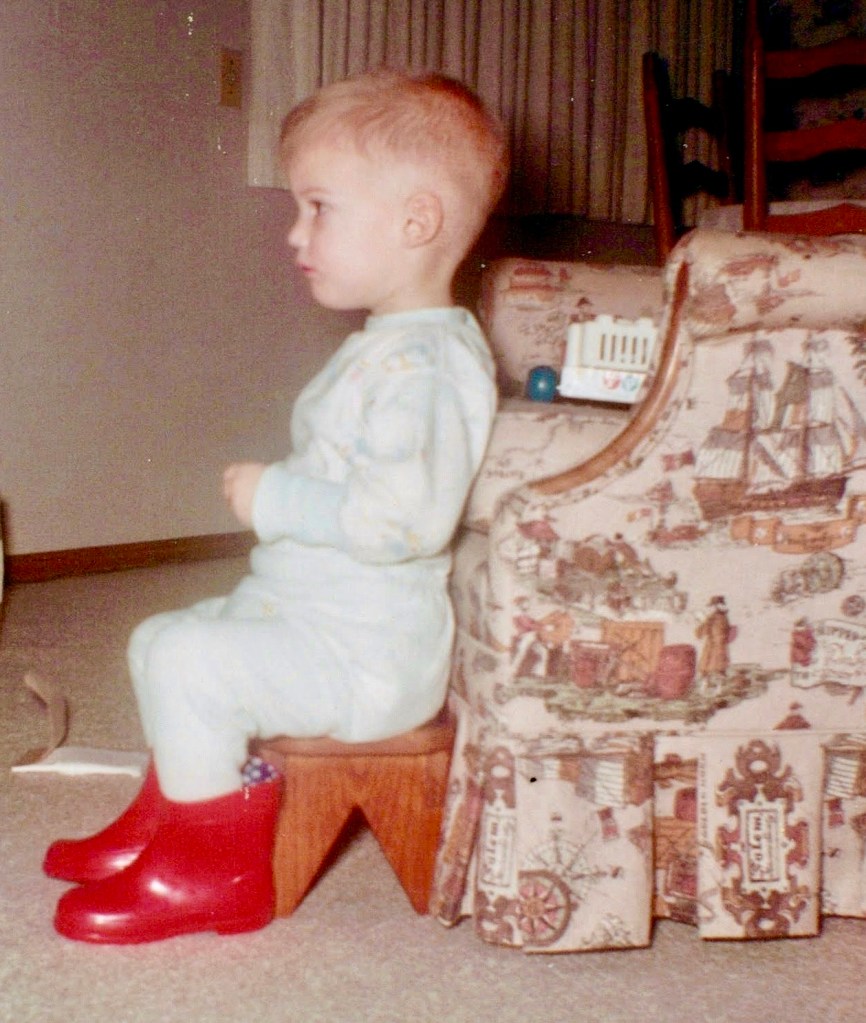 A favorite of my first batch of Fisher-Price toys was the Chatter telephone from our neighbors, the Robbins. It had a rotary dial which rang a bell when turned and released. When pulled, the phone made a “chatter” noise and the eyes went up and down. My phone’s body was made of wood, but its top, dial, handset, and wheels were plastic. You can see it sitting on the chair behind me in the photo, where I am sitting on a little stool my father had made in his high school shop class. I am wearing my red boots while watching our RCA Victor black-and-white television set, which was out of the camera view.