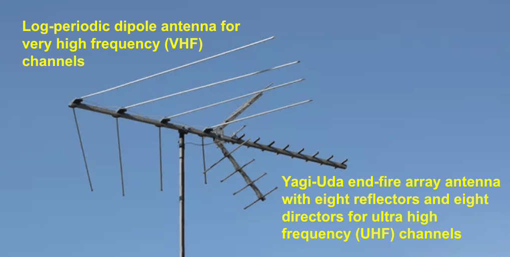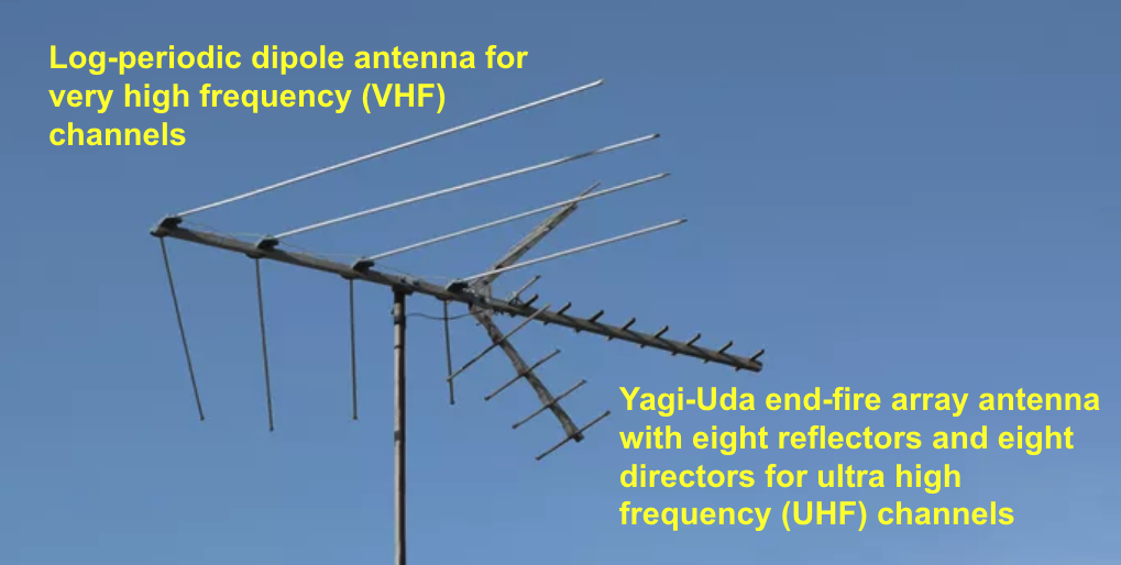 Years ago, several of the long elements on the log-periodic part of my antenna snapped off in a storm, so my antenna can no longer reliably pick up VHF channels 2-8. But the Yagi-Uda part is intact, so it can still pick up Tulsa area stations 6, 8, 11, 23, and 41. You might wonder how an antenna that can’t pick up channels 2-8 can pull in stations 6 and 8; allow me to explain.