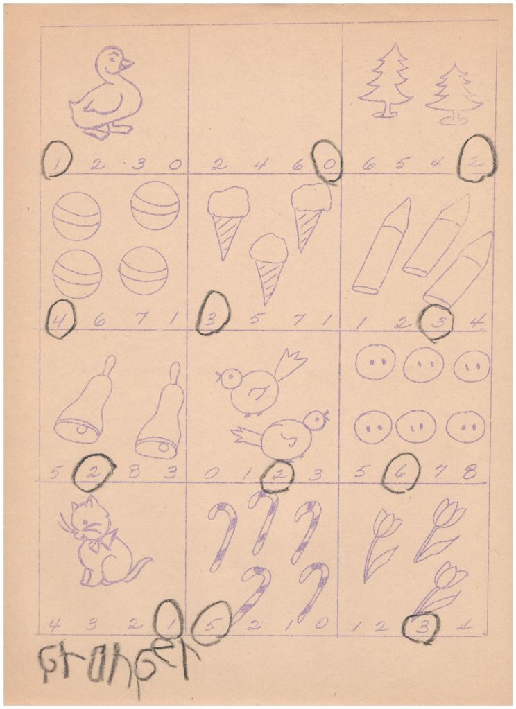 My parents saved a few of my kindergarten papers, including one where I used a black crayon to identify how many objects I saw.