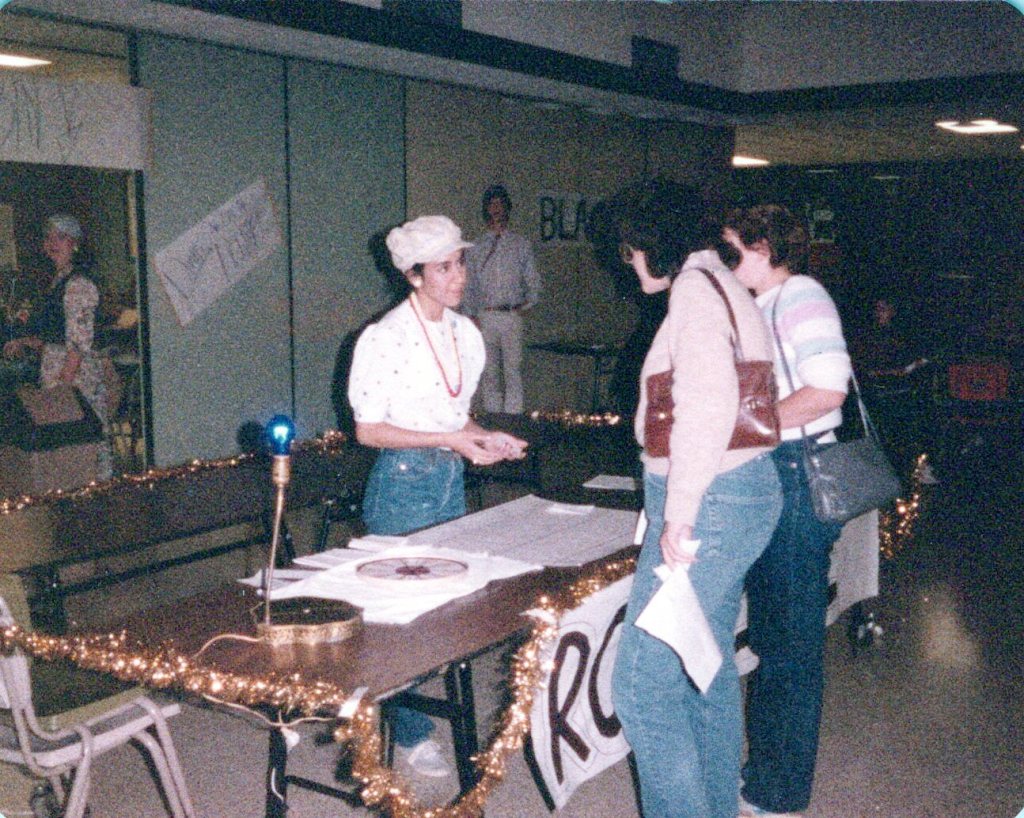 Our club’s fundraiser was Cosino Casino, where people bought tickets in the school cafeteria one evening to use in playing games of chance. We included math lessons with each game, and my girlfriend and I were charged with running a roulette table. We bought a cheap lazy Susan turntable at the T.G.&Y. and my girlfriend decorated it and ran the table.