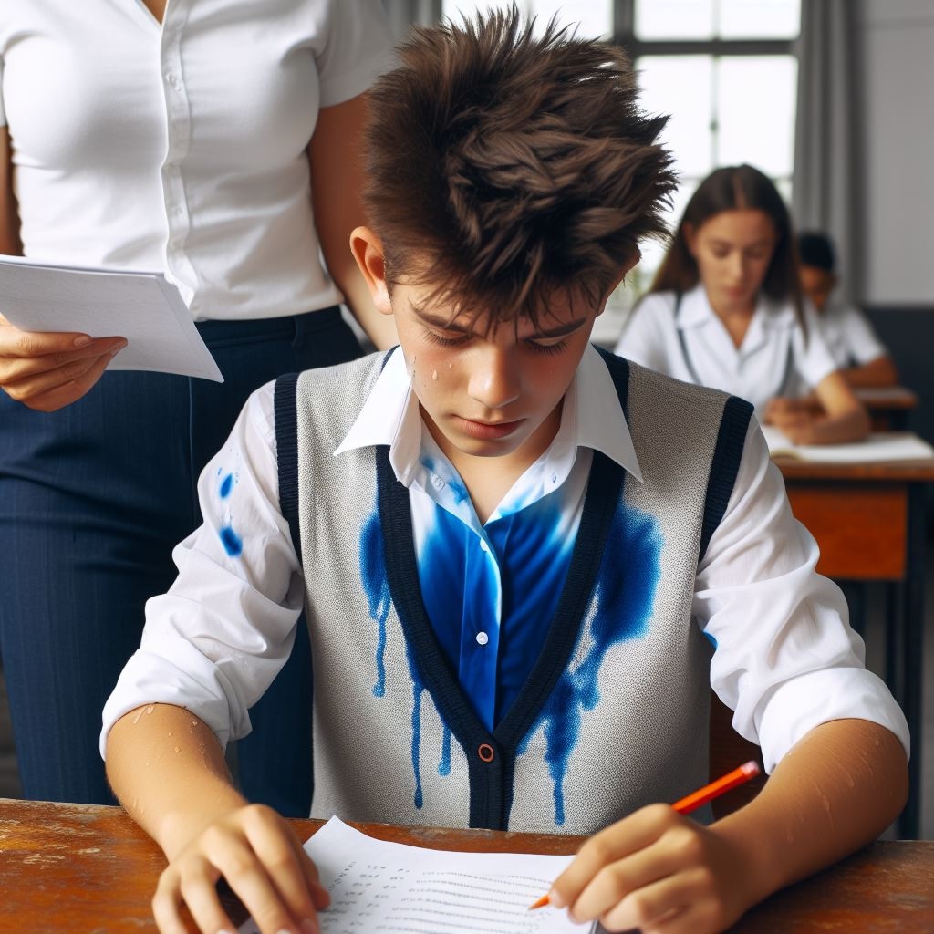 When Mrs. Zaffos started passing out the papers, I felt terribly guilty about my impending behavior and began to sweat profusely. She reached me and exclaimed, “What is wrong with your shirt?”