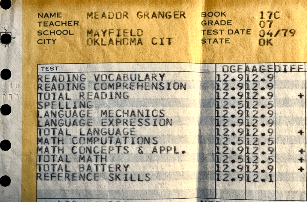 Well, yeah, I was an outlier on one end in PE and on the other end in academics. In April, we all had to take the California Achievement Test. My Obtained Grade Equivalencies were all grade 12…even in math.
