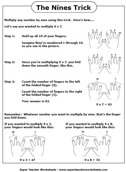 Oh, how I hated it! The only thing I liked was realizing that the sum of the digits in the answers to all of the nines added to nine. 9×3=27 and 2+7=9, 9×6=54 and 5+4=9, and so forth.