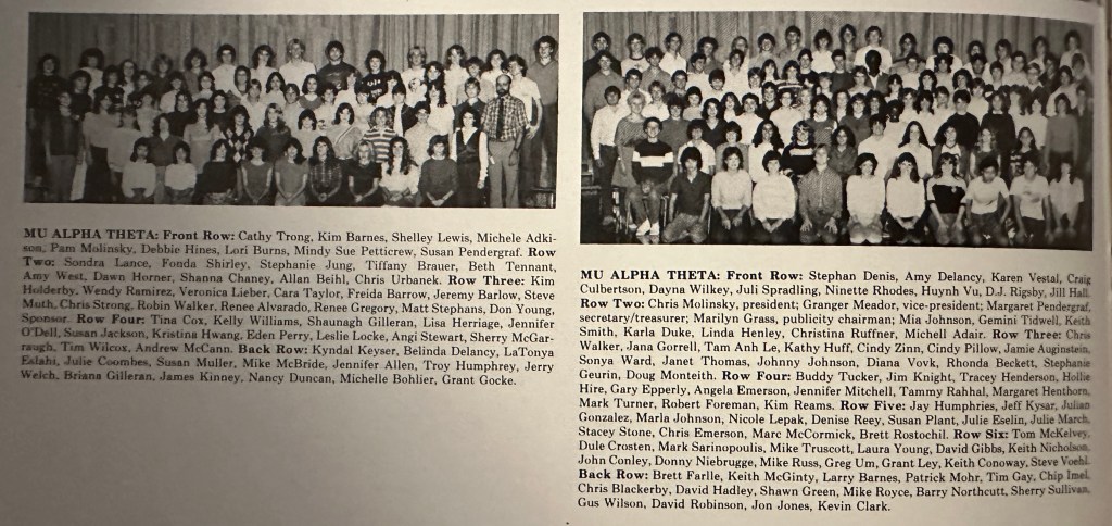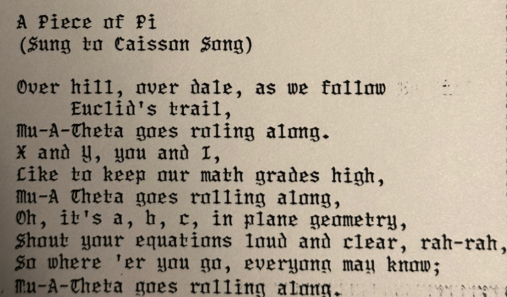 In 10th grade, I had been elected homeroom representative for our Honors Algebra II class in the Student Council, but I didn’t start actively running for offices in student organizations until I went steady with a girl starting in 11th grade. She was more extroverted and motivated me to become the Vice-President of the Honor Society, Parliamentarian of the Junior Classical League, Secretary of the Science Club, and, of all things, Vice-President of the rather large Mu Alpha Theta club…Mu Alpha Theta…MATH.