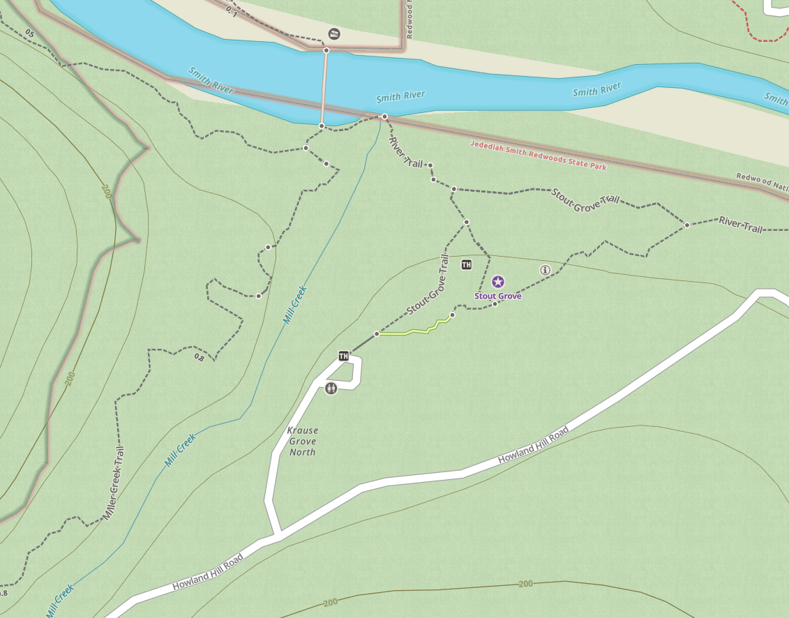 Stout Grove was the first one donated along Howland Hill Road in 1929. The last of the redwood groves along the route was purchased and donated to the State of California in 1949 with funds raised by the Garden Club of America, the Daughters of the American Revolution, and thousands of other donors for a memorial grove for fallen soldiers of World War II.