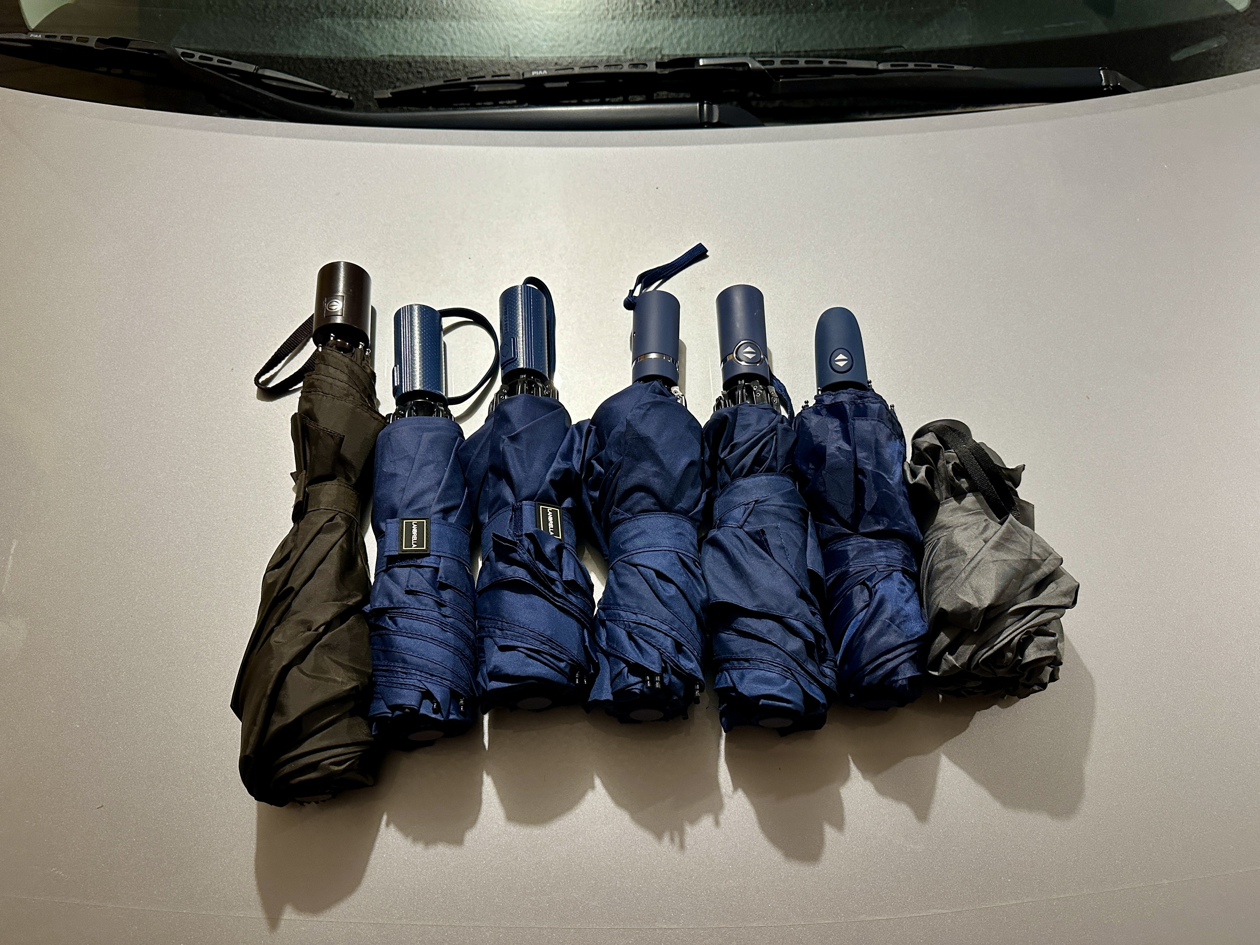 As for umbrellas, I just went out to my car and counted. There was one little umbrella in the driver door and six larger ones in the trunk, ready to be left behind in restaurants on rainy days. Our rainstorms just don’t last long enough for my protection.