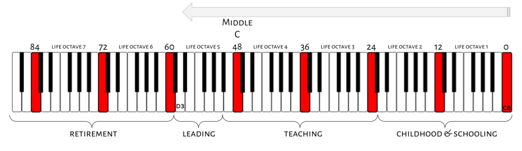 I think of my personal timeline like playing a piano keyboard right to left, starting with the highest pitches and working my way to the low notes, possibly getting to play 88 keys across over 7 octaves. The top two octaves were high tinkly notes I played while growing up, I am almost done playing three middle octaves while working at Bartlesville Public Schools, and I hope to play at least a couple of final octaves in retirement.