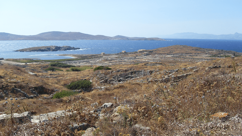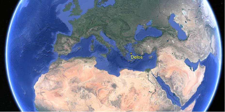 Delos is a tiny island, only a bit over one square mile in area, that was a cult center for the gods Dionysus and Leto. A Greek saying was “ᾌδεις ὥσπερ εἰς Δῆλον πλέων” meaning “you sing as if sailing into Delos” when someone was in a happy and light-hearted state.