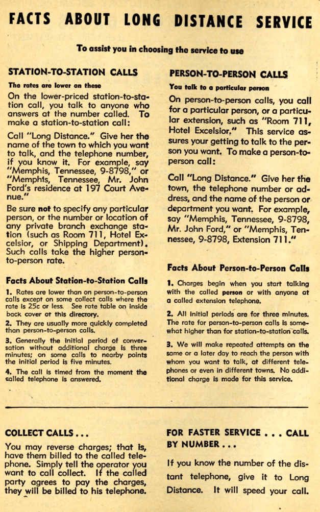 I’ve shown a page from the 1955 Bartlesville telephone directory with instructions on how to make a long distance call. You can tell they didn’t have Direct Distance Dialing yet!