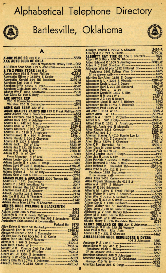 In the early days, there were so few telephone lines in smaller communities that phone numbers were just a few digits. The 1907-1908 Prewitt’s Directory for Bartlesville, Indian Territory, which was printed just before statehood, has phone numbers of two and three digits.