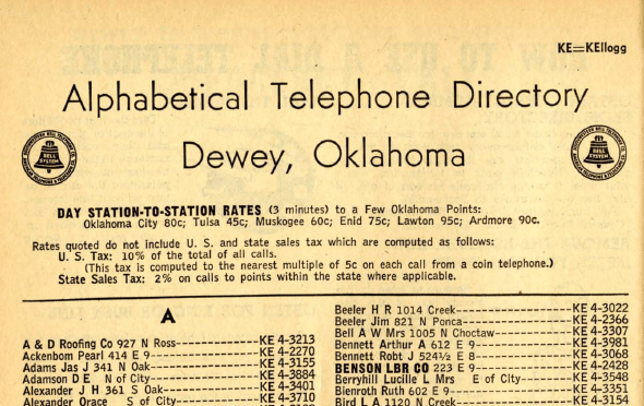 The use of phone exchange names in phone listings began to be phased out in the 1960s, so FEderal and EDison didn’t last very long in Bartlesville. I was assigned a 335-#### phone number when I moved to town in 1989, so I suppose I could have shared it as EDison5-####, but that would have elicited some stares and confusion.