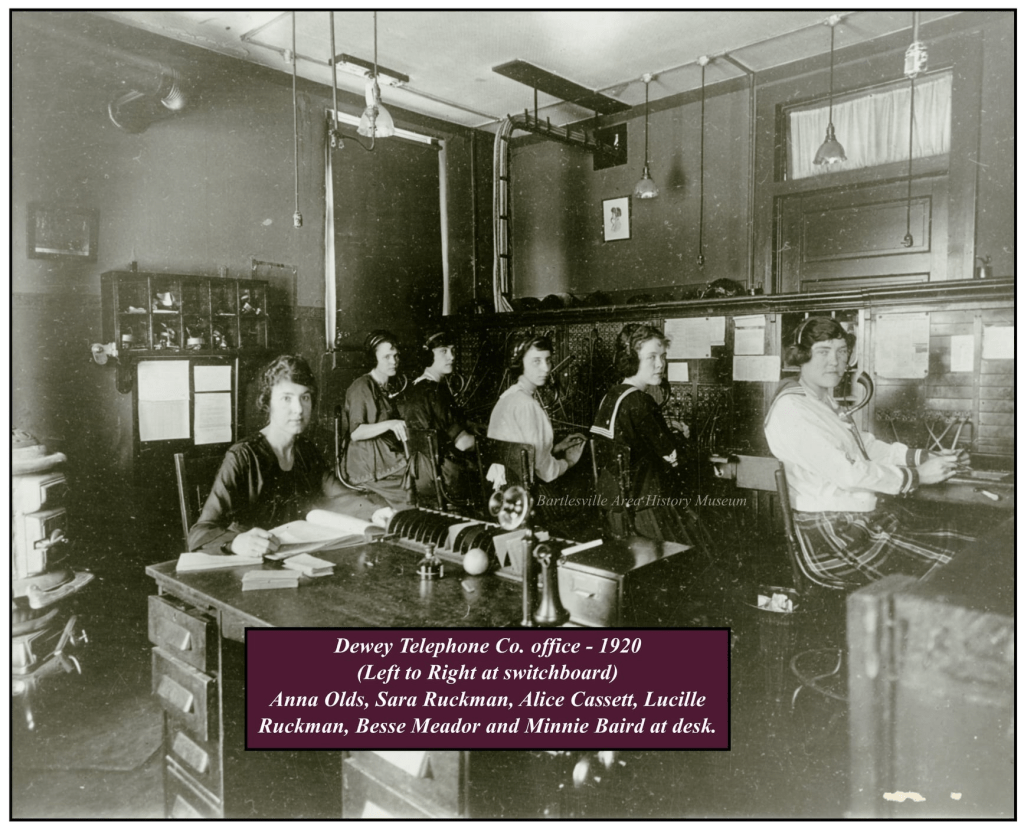 Telephone service in Bartlesville dated back to the late 1800s with an exchange above the Hull Drug Store on the south side of 3rd Street (now Frank Phillips Boulevard) between Johnstone and Dewey Avenues. It opened with three phones, which expanded to seven, and the bell was hooked to the bed of the operator. The first telephone operator was a Ms. Green, and many of the early phones were for doctors.