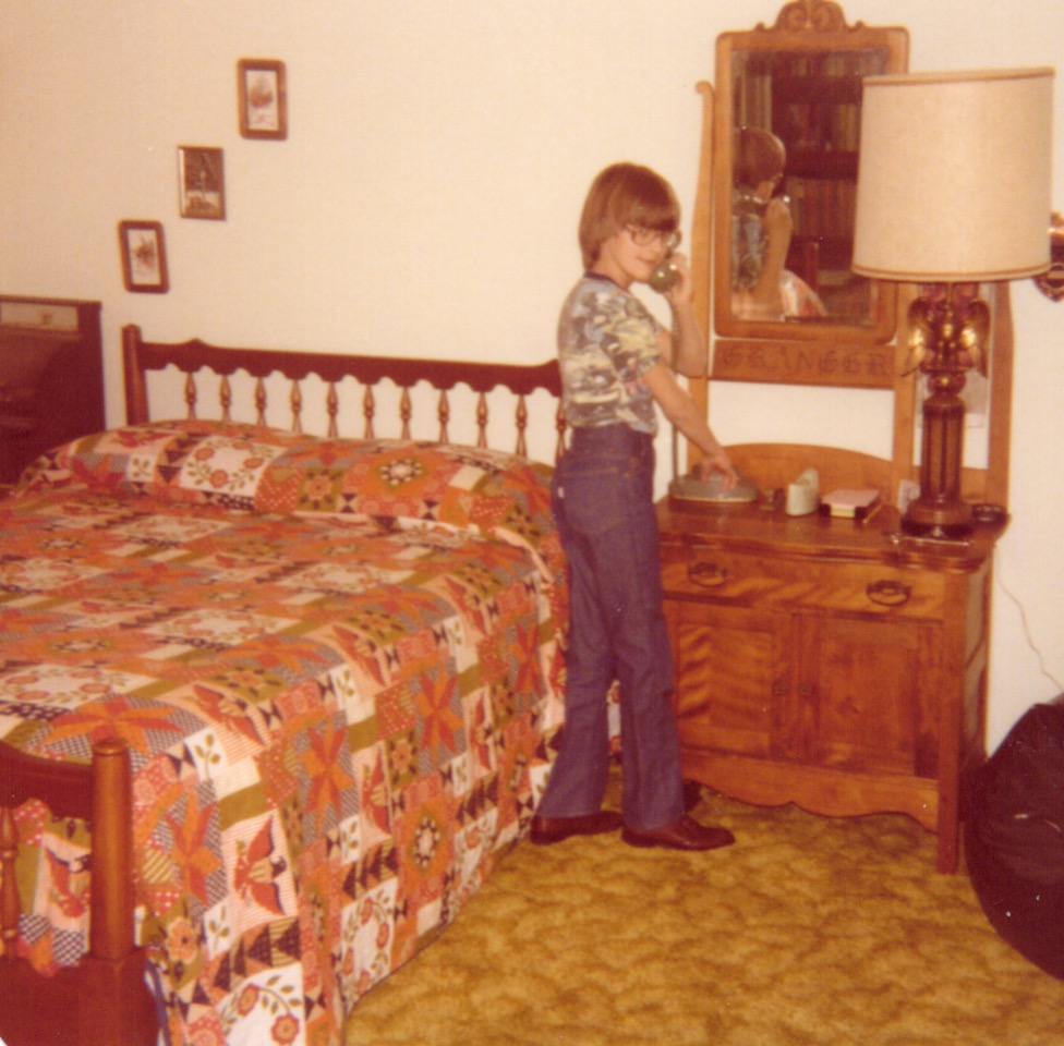 I got an extension phone in my bedroom. Throughout my childhood people would ask me for my favorite color, and I had settled on green, although I didn’t particularly care. So yes, I had a green phone. I found a 1978 photo of me proudly showing off my new phone, and I remember lying on the bed a few years later while on the phone for hours for many nights trying to puzzle through algebra homework with schoolmate Susan Plant.