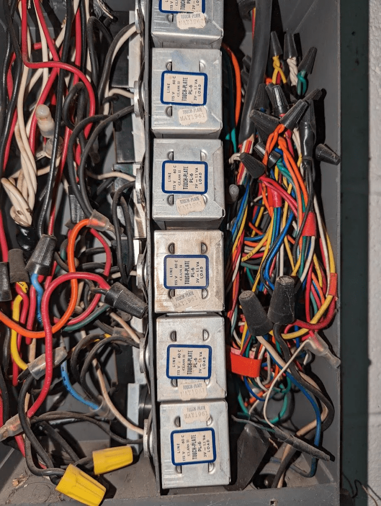 Pressing the tab one way or the other briefly energized a 24-volt line leading to one of several latching relays on regular 120-volt circuits for the various lights. The set of relays were all mounted together in a panel in the garage. The relays were what opened or closed the actual lighting circuits, themselves being triggered by thin 24-volt lines leading off to the various switches.