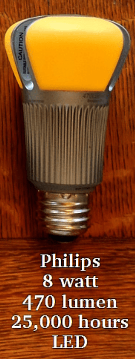 However, my two oldest LED bulbs are still going. Back in 2011 or so, I purchased those Philips Ambient bulbs. They were primitive by today’s standards, with a light output equivalent to only a 40-watt incandescent bulb, huge heat sinks, and yellow-orange covers for the LEDs to produce a warm white.