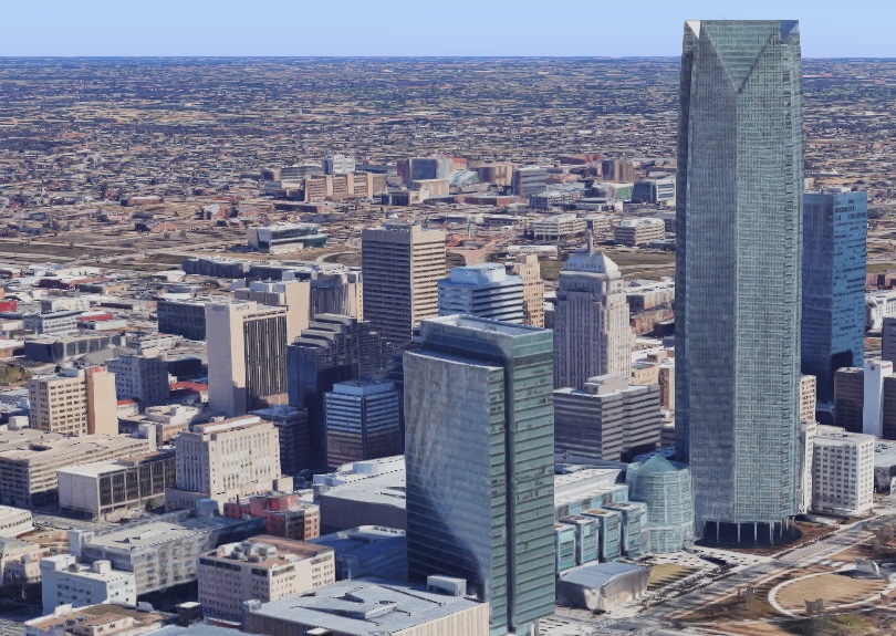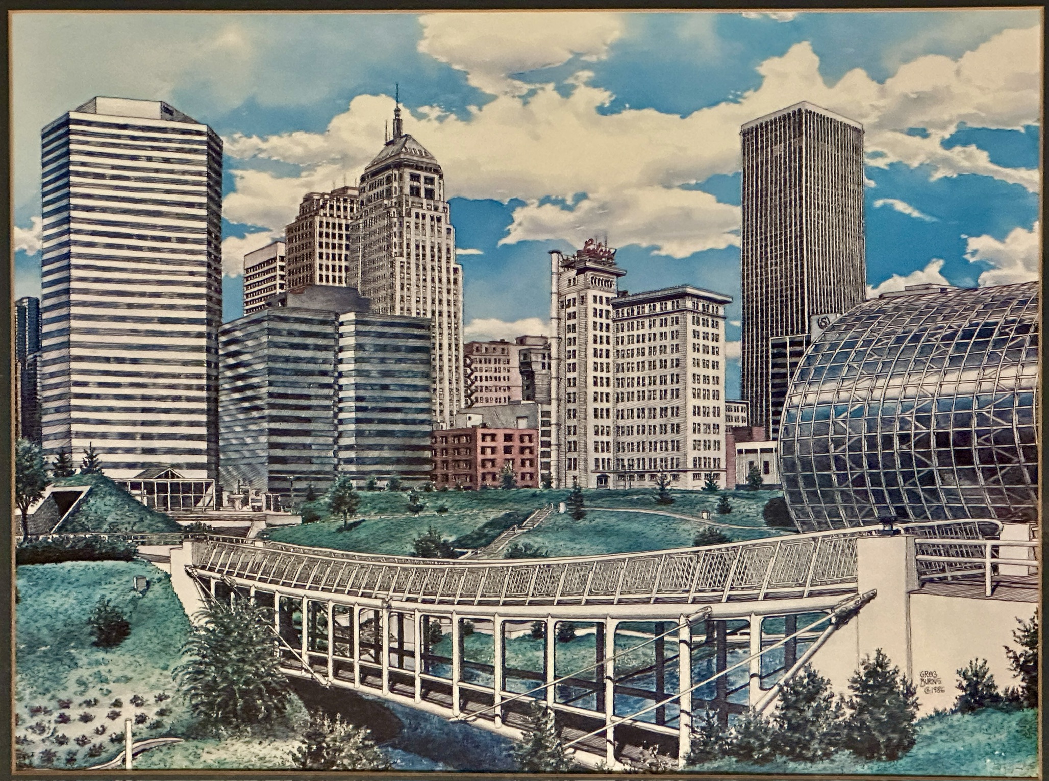 When I look at Greg’s artwork, my eye is always first drawn to the majestic First National Bank building of 1931, which had the Beacon Club up top and step-backs reminding everyone of the Empire State Building; that was where my late father worked for Cities Service Gas. It eclipses the Ramsey Tower, which seems symbolic. My gaze then drops down and right to the old Colcord building, and finally takes in the end of the botanical tube and the double-decker pedestrian bridge of the Myriad Gardens.