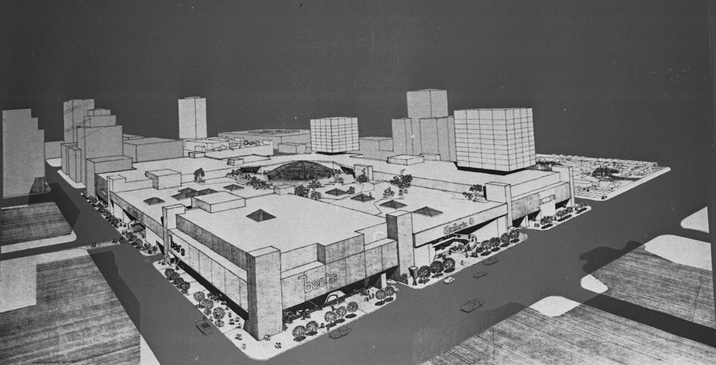 Click the 1970 aerial view below to see my overlays for the areas that were cleared. We’ve already covered The Myriad, its Gardens, and the Century Center. I shall conclude with the great failure: the largely unfinished Galleria.