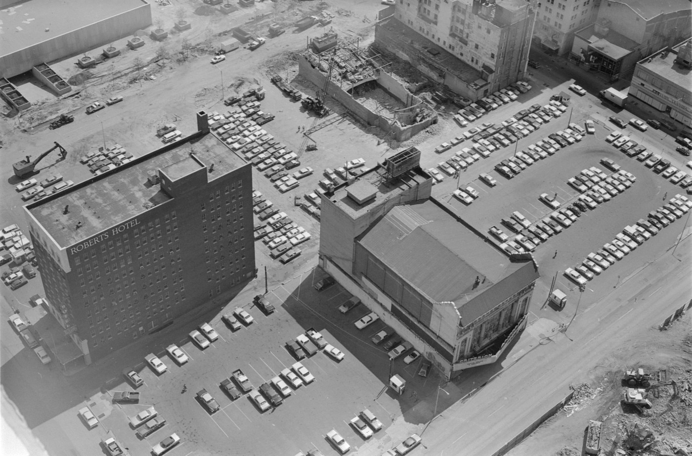 Four tall buildings lined up along Sheridan Avenue were taken down, one east of Robinson Avenue for The Myriad, and three west of Robinson for its Gardens. By the way, Sheridan Avenue itself was Grand Avenue from 1889 to 1961. The city council sought to rename the street Sheraton Avenue in honor of the Biltmore Hotel being rebranded as a Sheraton. (The Pei Plan called for keeping it, but it would famously undergo a televised explosive demolition in 1977.)