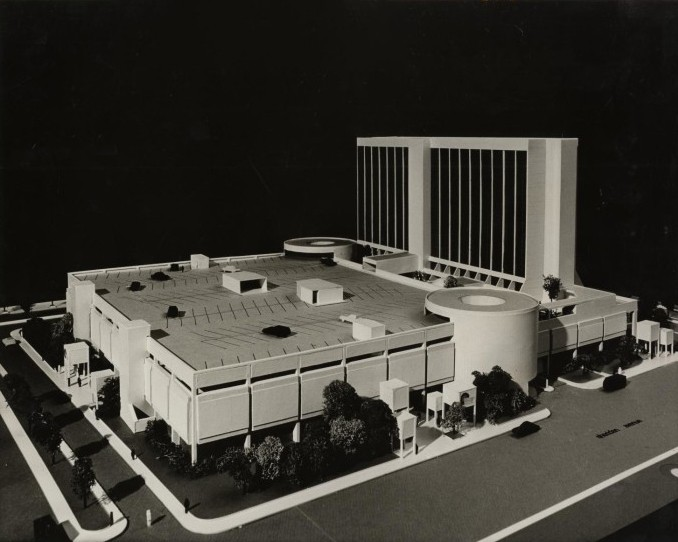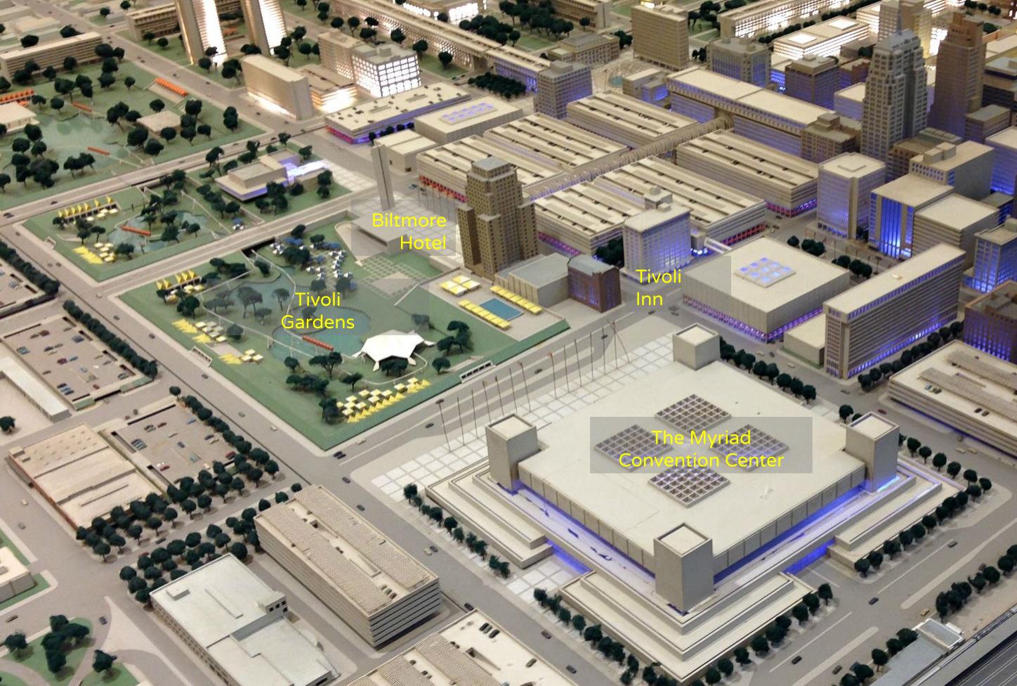 The Pei Plan had called for the “Tivoli Gardens” to the west to act as The Myriad’s “front lawn”. A convention center needs hotel rooms, so his plan called for using the existing 26-story Biltmore and shorter Tivoli Inn that fronted along Grand/Sheridan Avenue.